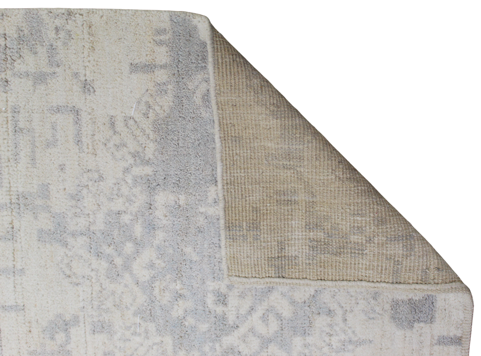 The design features faint geometric medallions and floral elements in a tone-on-tone ivory and soft gray palette. The muted colors and distressed finish give the rug a contemporary, minimalist look while retaining the charm of traditional handwoven craftsmanship.