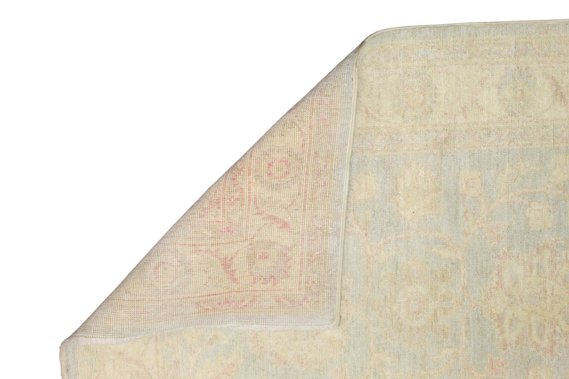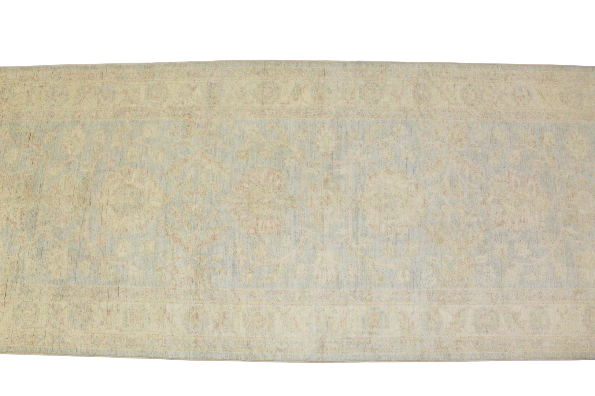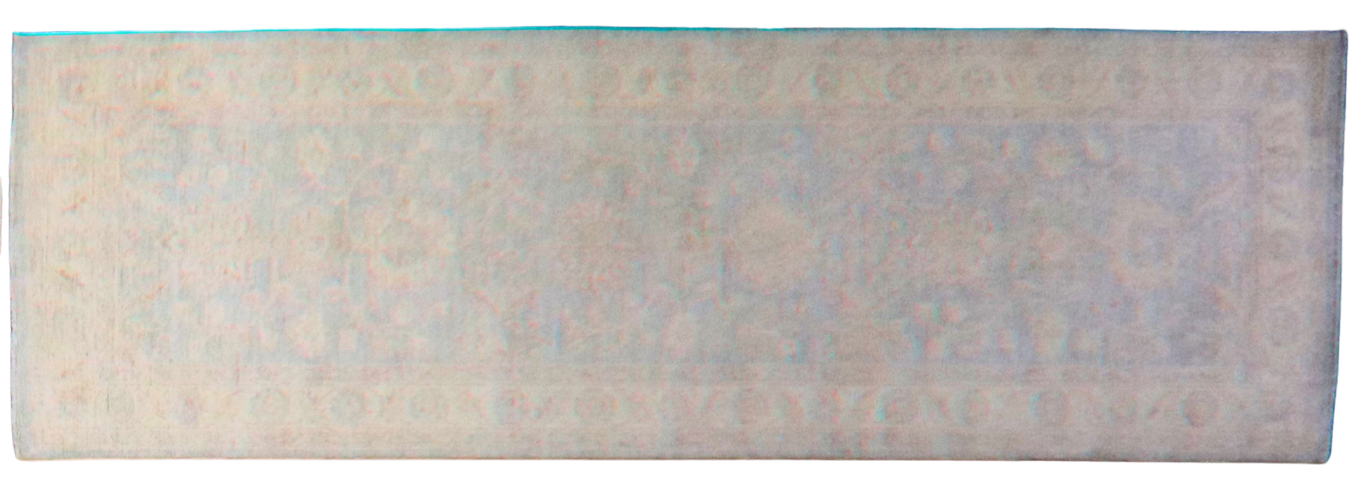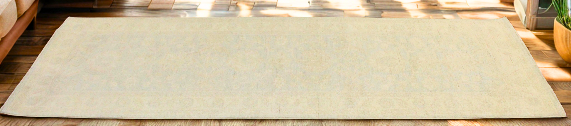 With a dreamlike presence and whisper-soft tones, this Afghan Oushak runner is a study in subtle elegance. Its pale ivory and faint misty blue design emerges like a mirage, revealing a delicate allover floral pattern with a gently distressed finish. The minimalist palette allows the texture and craftsmanship to shine.