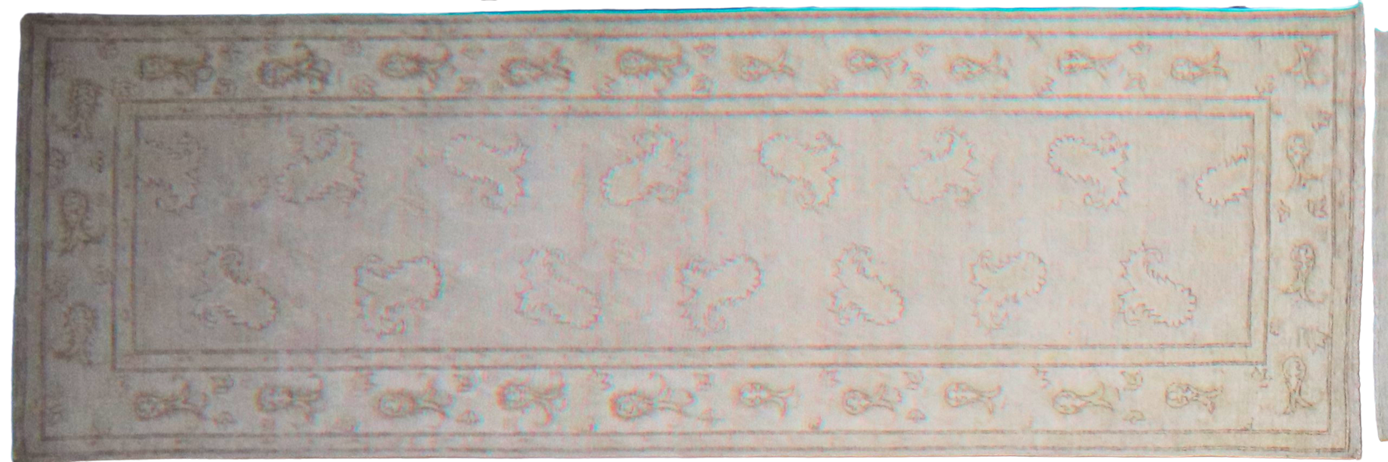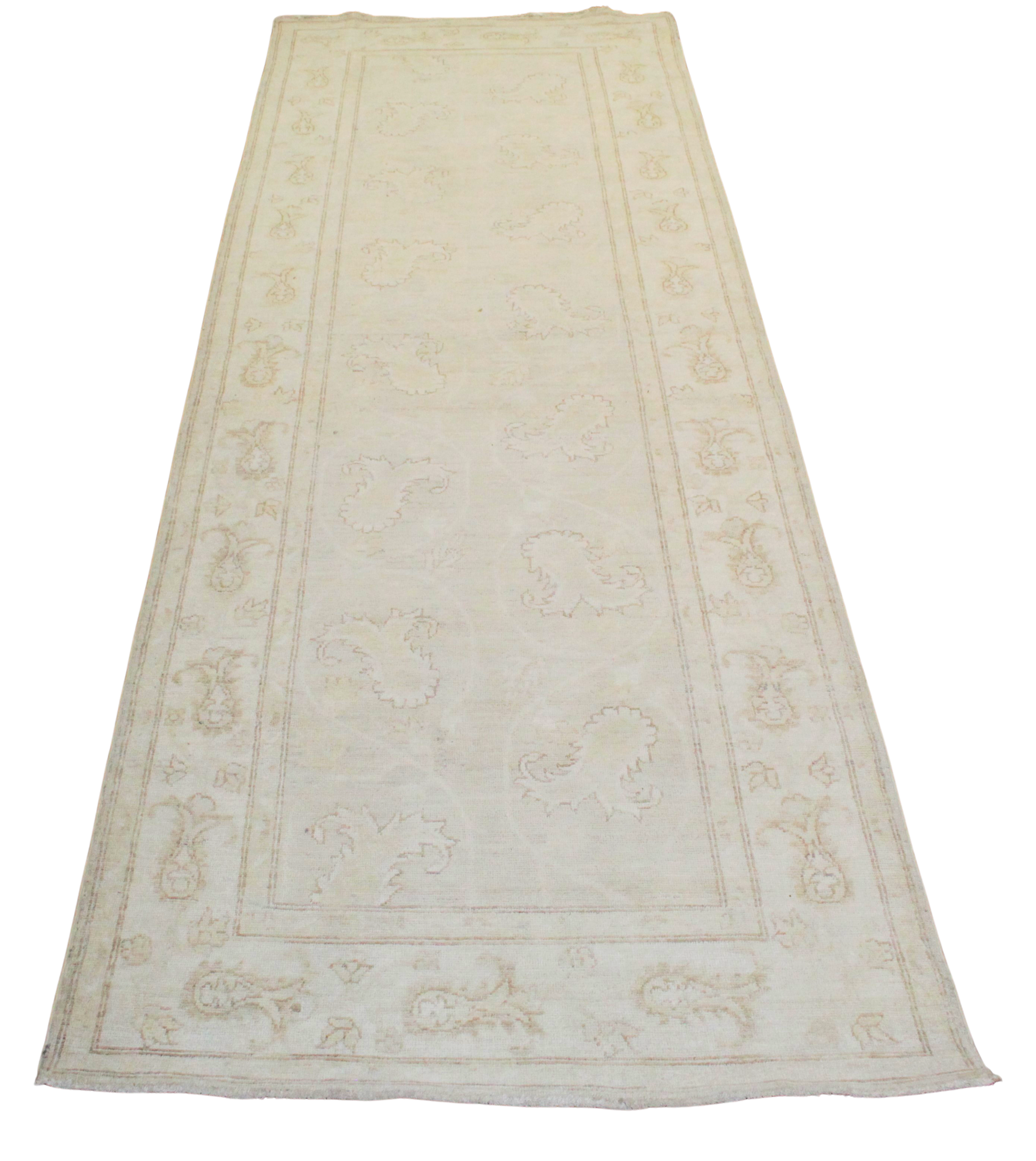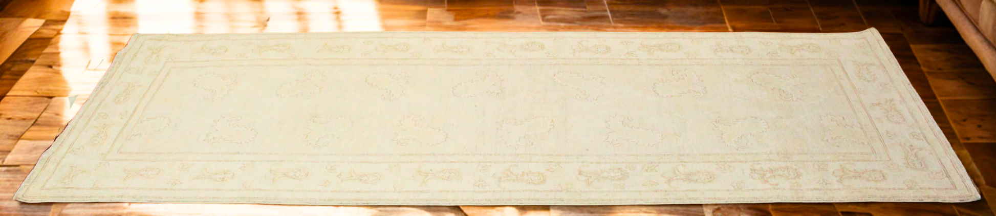 Gracefully understated yet full of character, this Afghan Oushak runner features a refined paisley motif woven in soft tonal shades of cream and pale beige. The repeated pattern gives it a contemporary rhythm, while the wool’s natural texture adds organic warmth. A delicate border of mirrored motifs frames the central field in quiet symmetry.