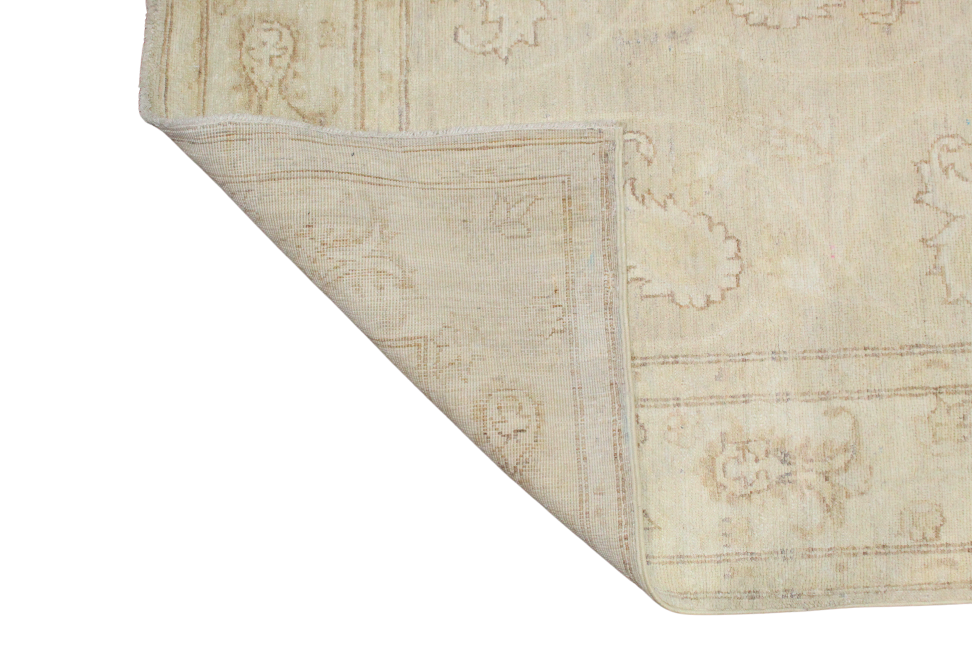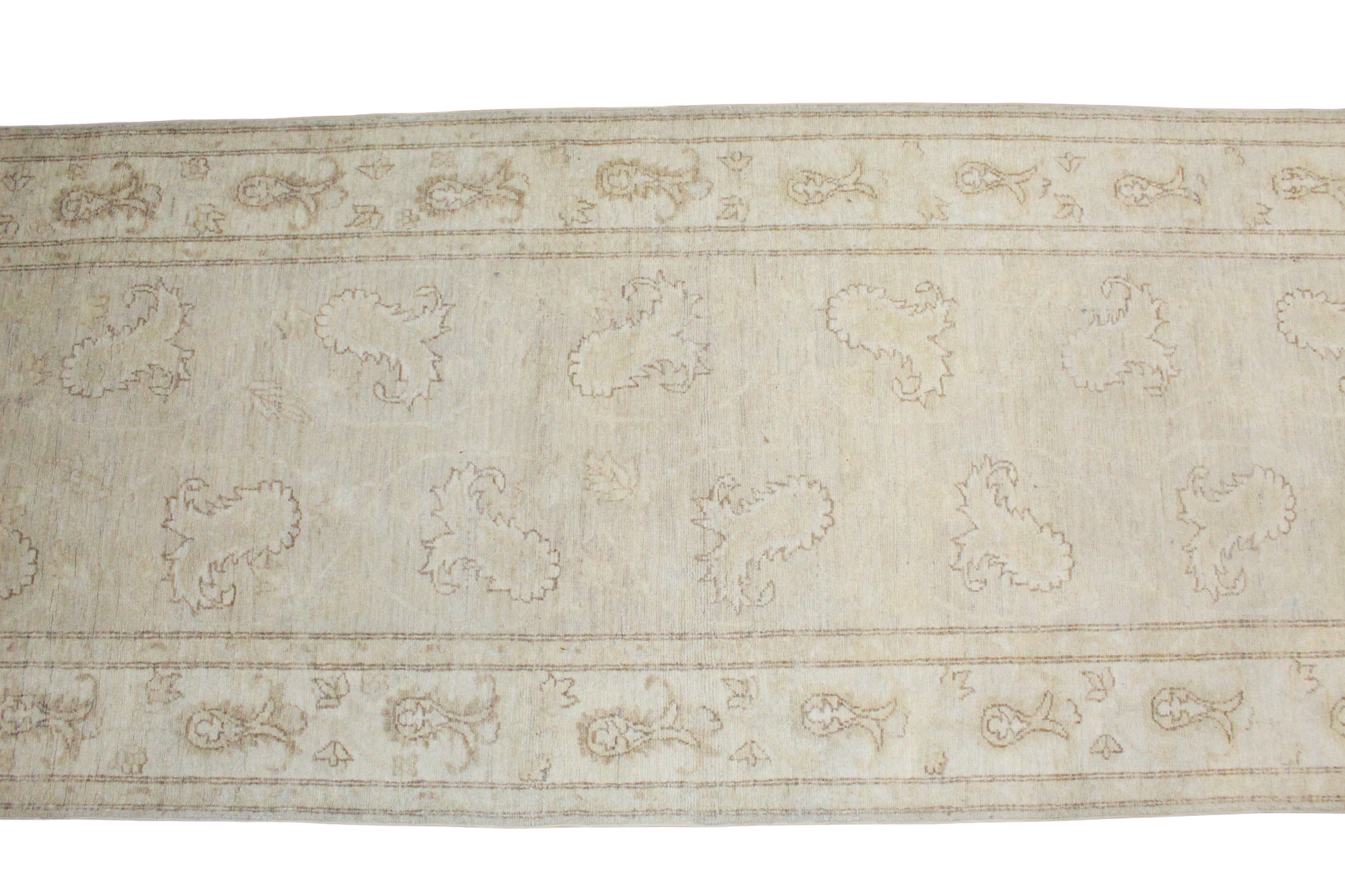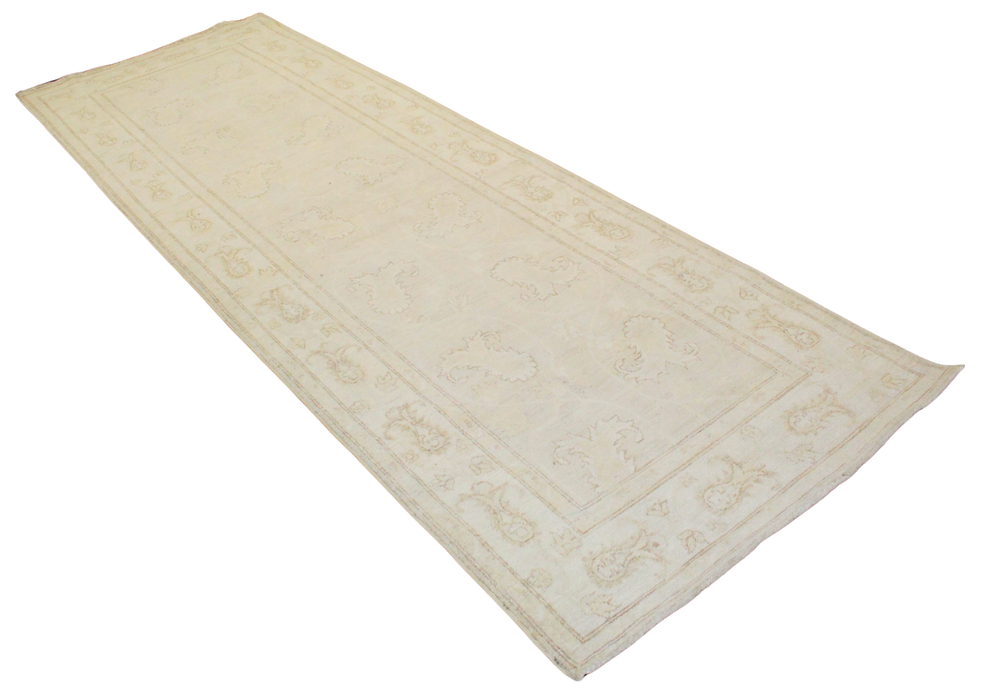 Gracefully understated yet full of character, this Afghan Oushak runner features a refined paisley motif woven in soft tonal shades of cream and pale beige. The repeated pattern gives it a contemporary rhythm, while the wool’s natural texture adds organic warmth. A delicate border of mirrored motifs frames the central field in quiet symmetry.