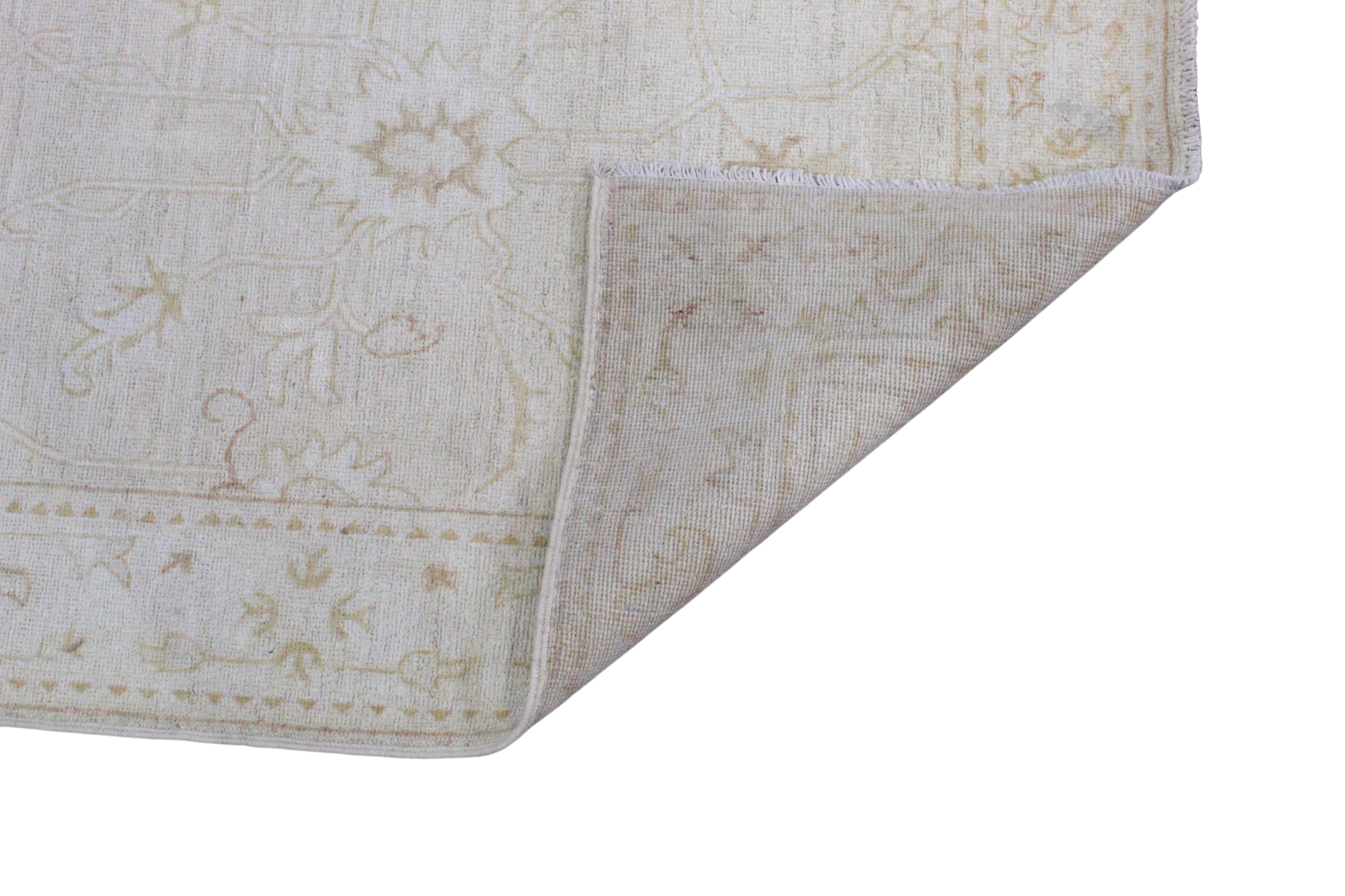A whisper of elegance runs through this beautifully hand-knotted Afghan rug, where a gentle floral lattice unfurls across a soft ivory field. Subtle touches of almond and sand rise from the wool pile, giving dimension to the quiet Oushak-style pattern. The tonal palette enhances its versatility, perfect for adding refinement without bold contrast.