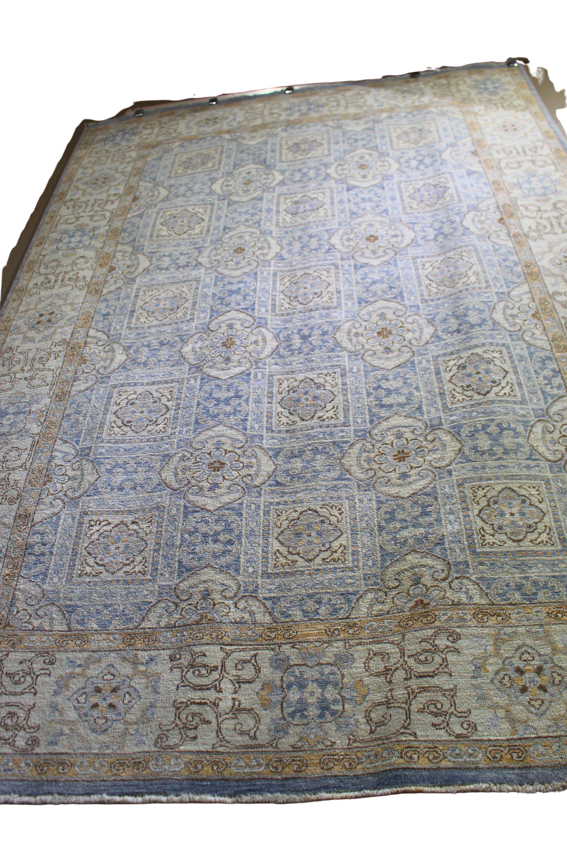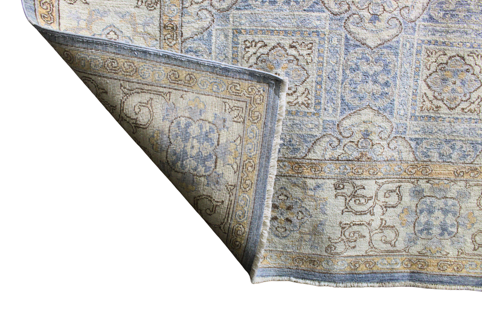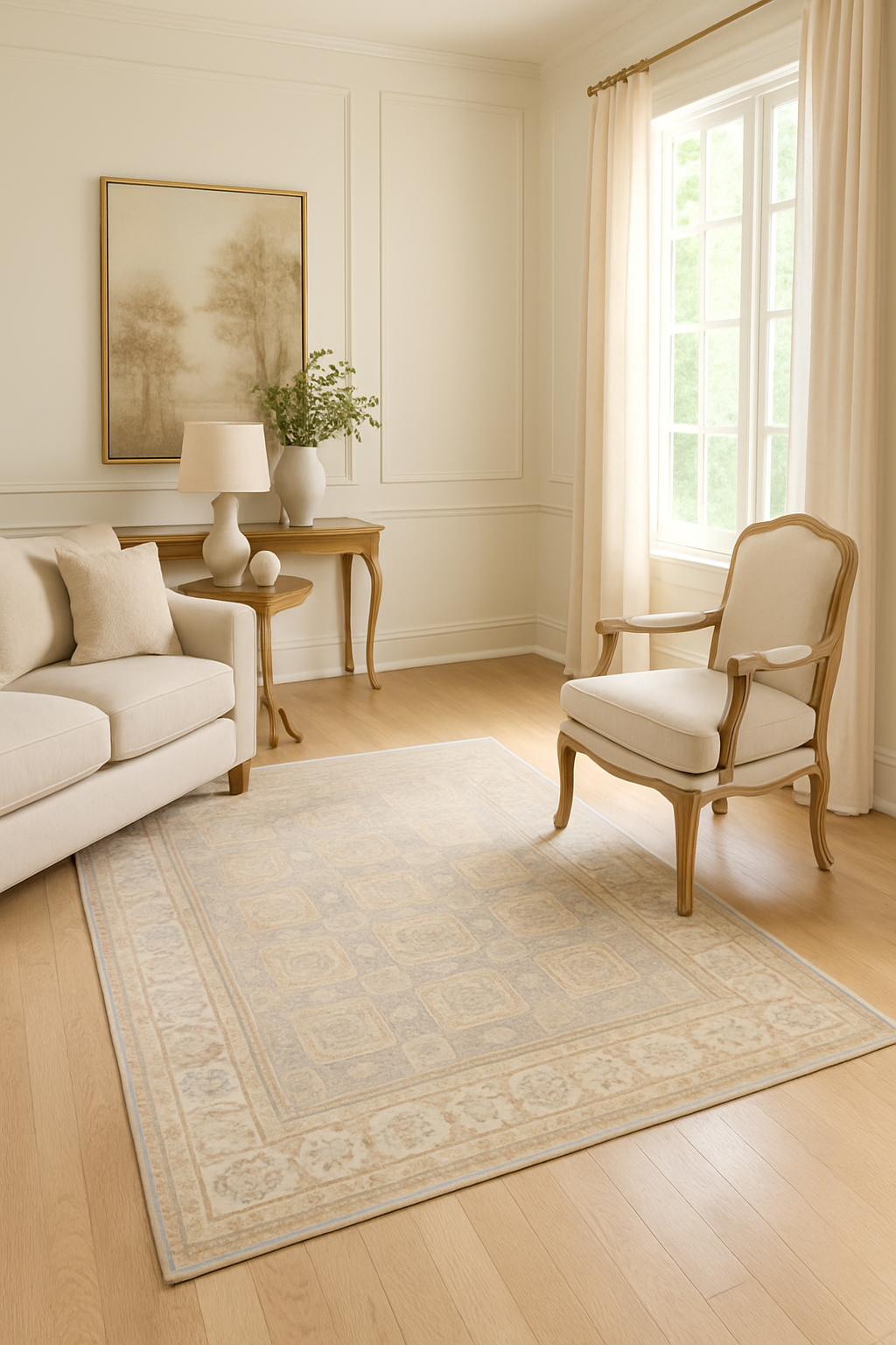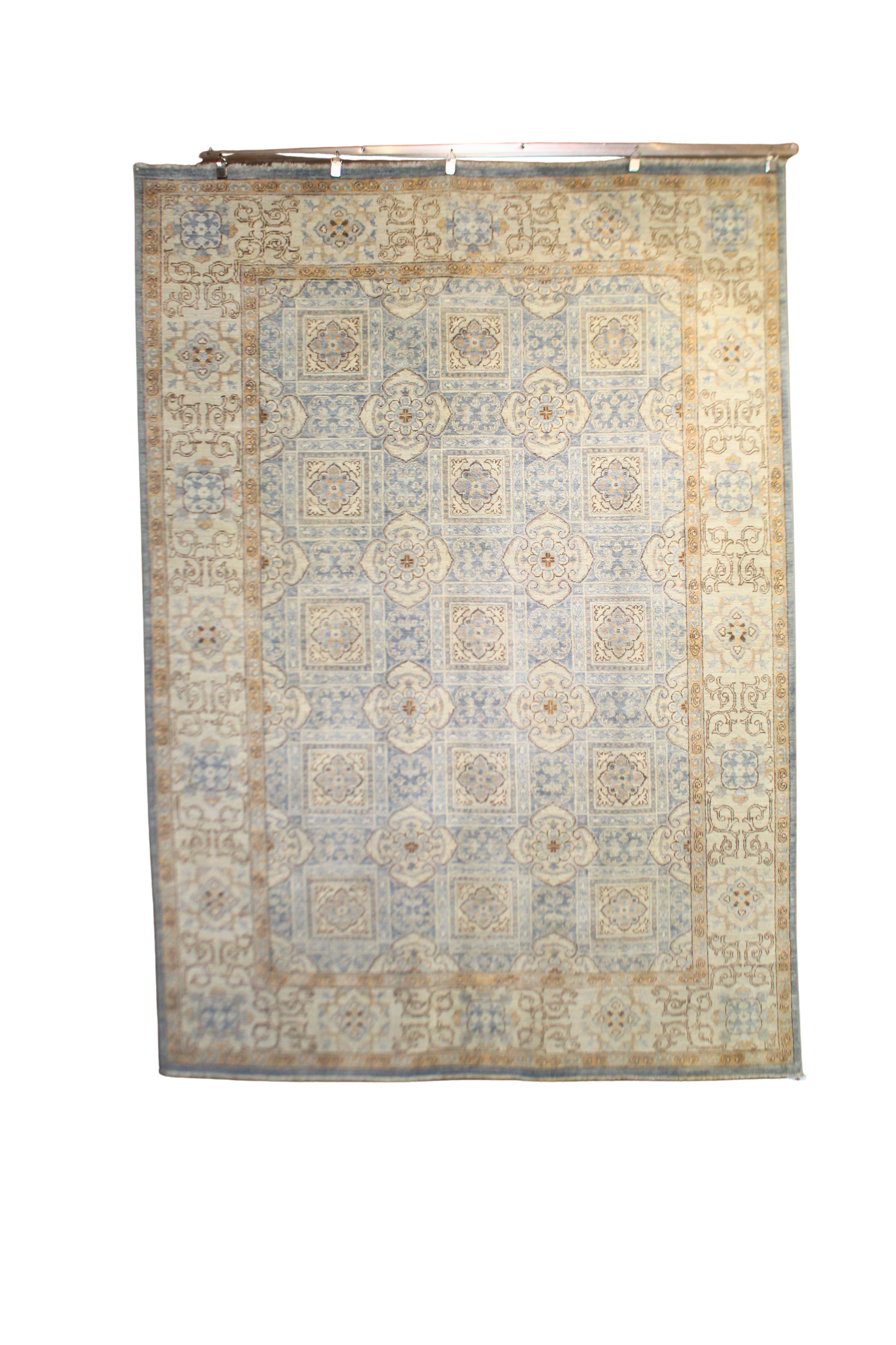Rendered in a calming palette of sky blue, ivory, stone beige, and faded sand, the rug’s geometric layout feels refined and balanced, perfect for traditional or transitional interiors seeking order and subtle texture. The border mirrors the inner pattern, tying the piece together with quiet rhythm.