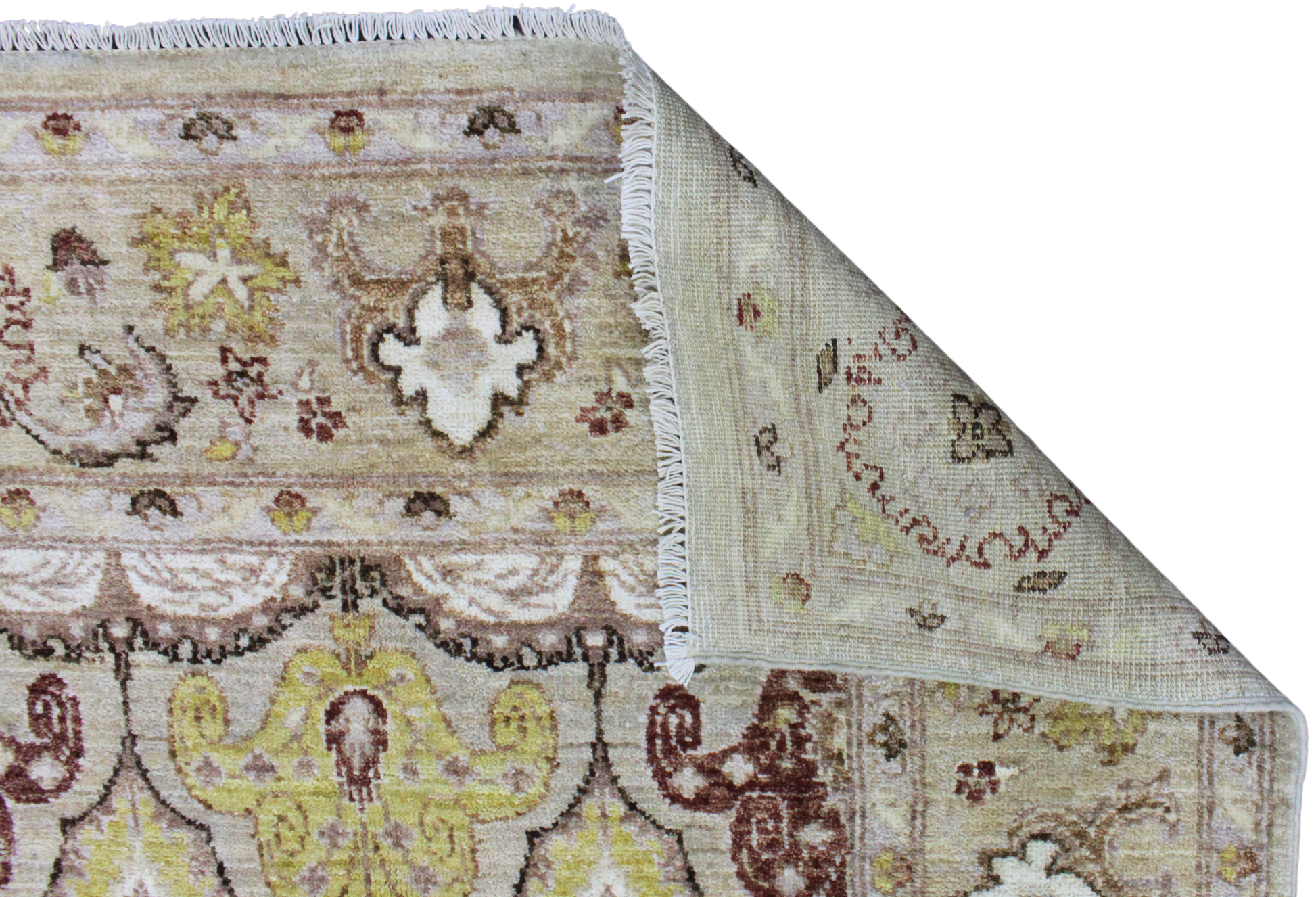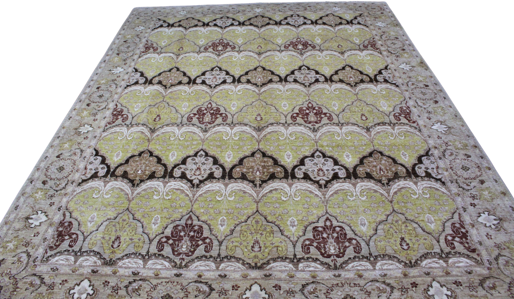Refined and majestic, this Afghan Tabriz rug (7.10 × 10.3 ft) draws inspiration from classical palatial architecture with its distinctive arch-like repeat pattern. Rows of scalloped medallions in golden olive, mocha brown, ivory, and soft rose are arranged in a cascading layout, creating a rhythmic elegance that feels both regal and serene. The border, intricately detailed in soft taupe and aqua tones, provides a graceful frame to the composition.