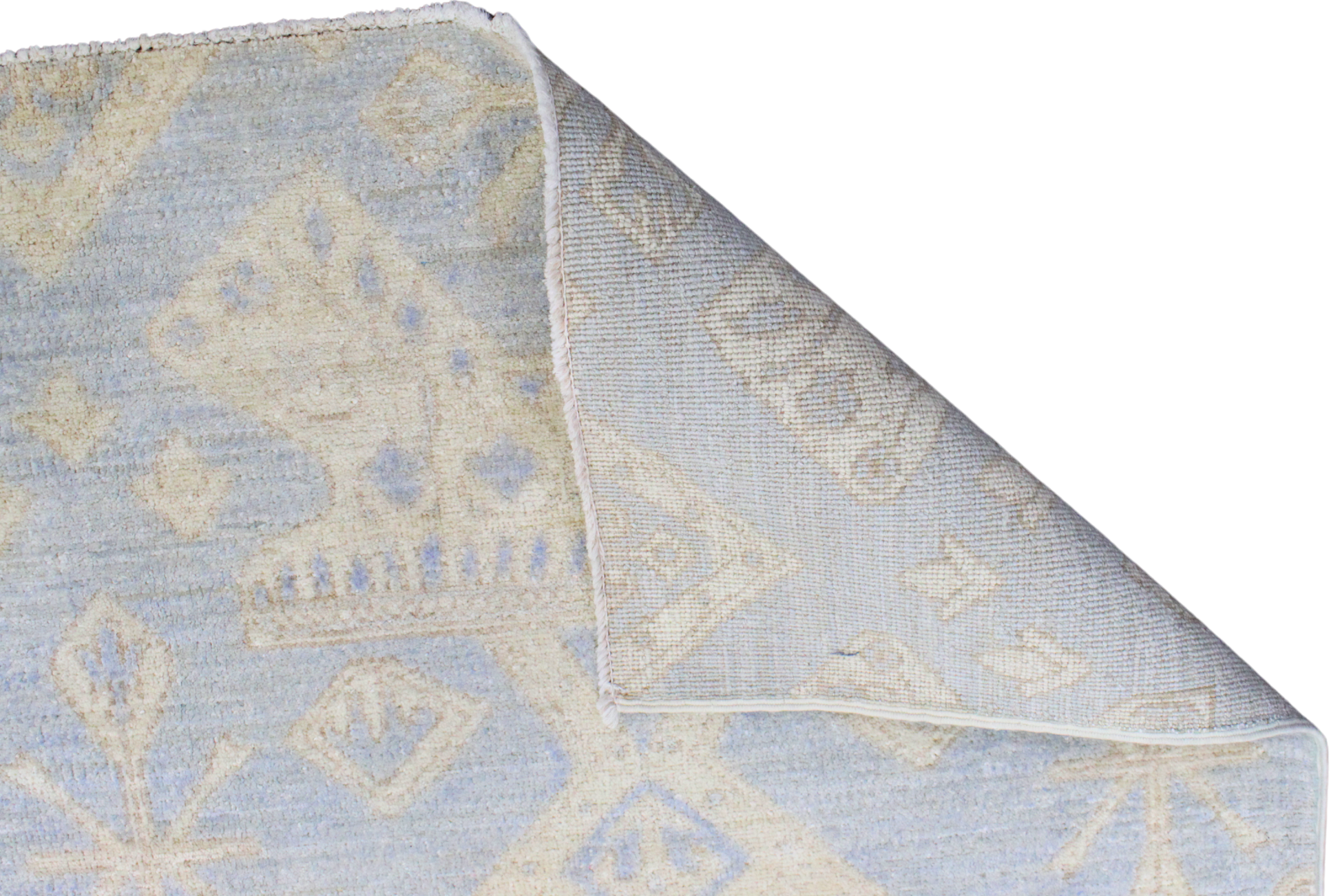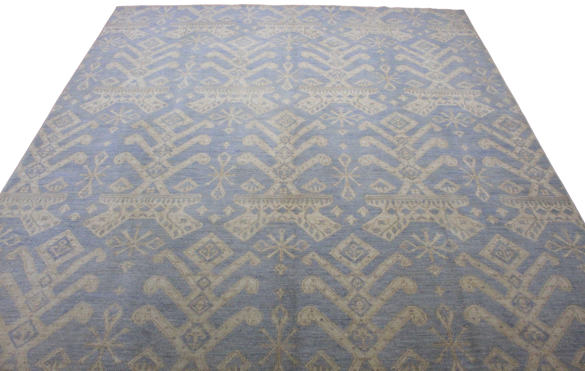 Airy, fresh, and effortlessly stylish, this Afghan Oushak rug (8.2 × 9.11 ft) offers a contemporary take on a time-honored weaving tradition. Its soft blue field is adorned with an allover tribal-inspired pattern in ivory, featuring diamond medallions, branching motifs, and delicate geometric accents. The gentle contrast creates a sense of calm sophistication, ideal for light-filled modern interiors.