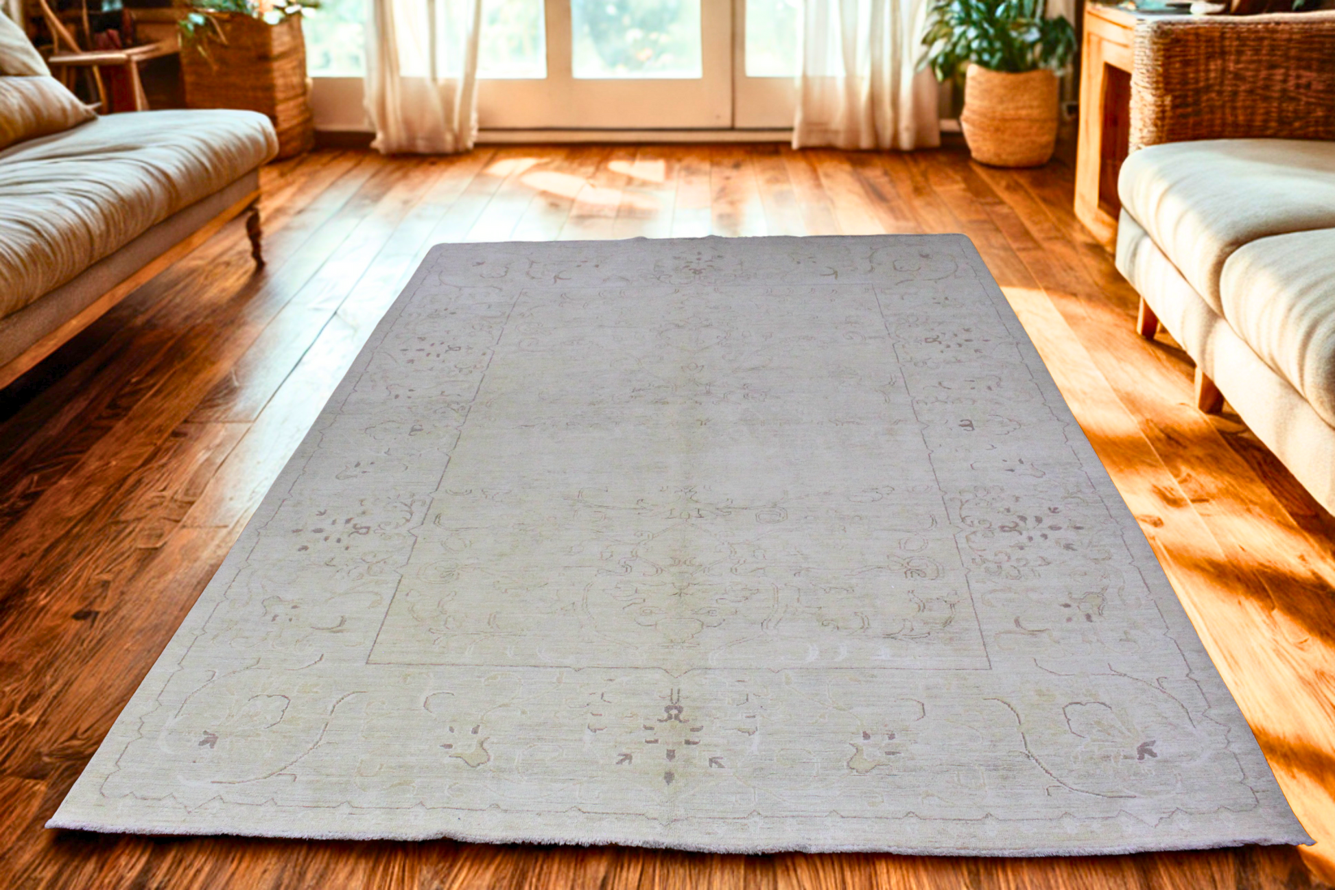 Softly spoken but full of presence, this Afghan Oushak rug (7 × 10.1 ft) radiates quiet sophistication with its tone-on-tone ivory palette and understated floral design. The subtle medallion and corner motifs are gently rendered in warm beige and pale cream, creating a textural pattern that emerges beautifully in natural light. Its washed-out elegance and neutral tones make it the perfect canvas for serene, airy interiors.