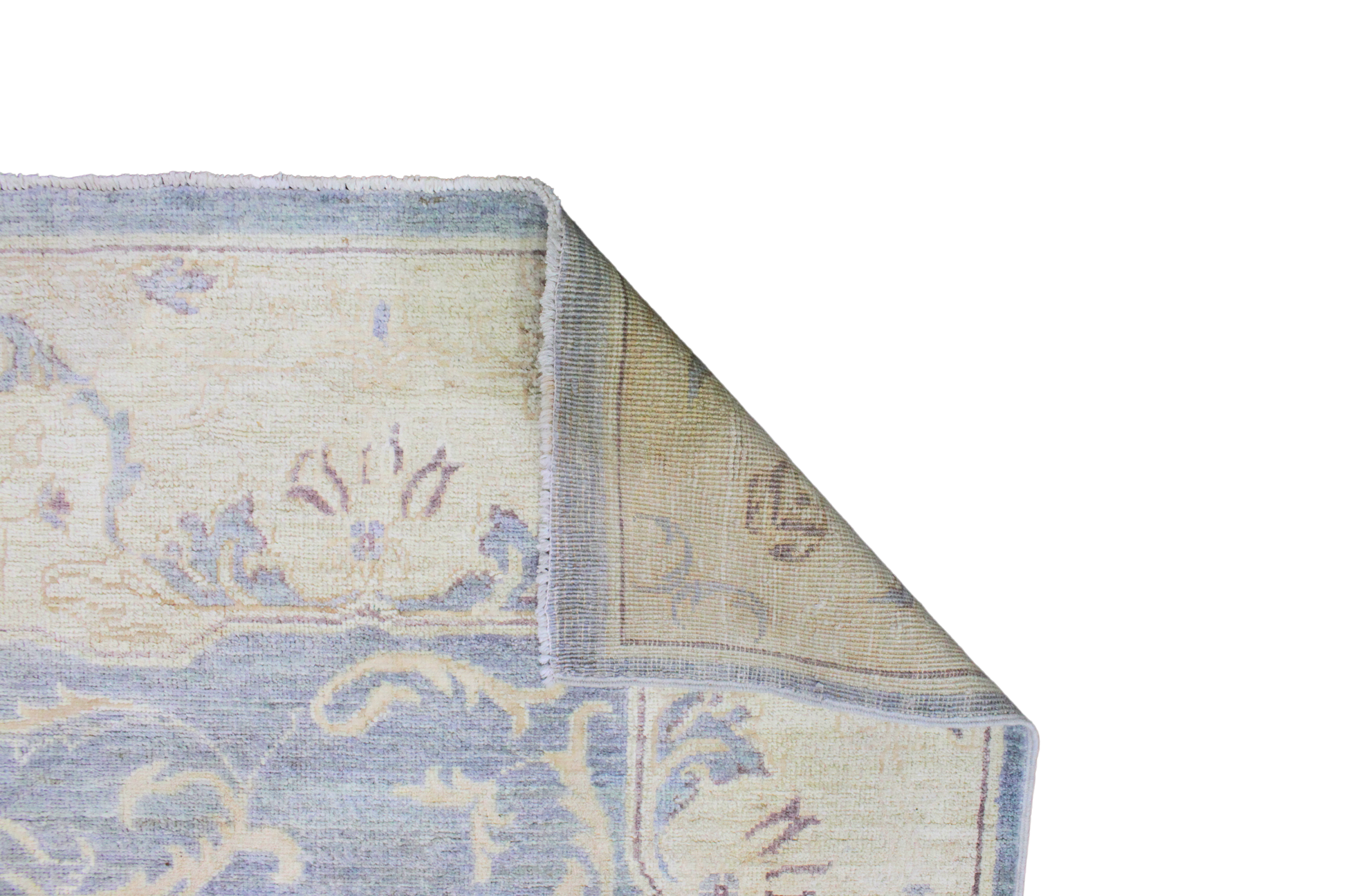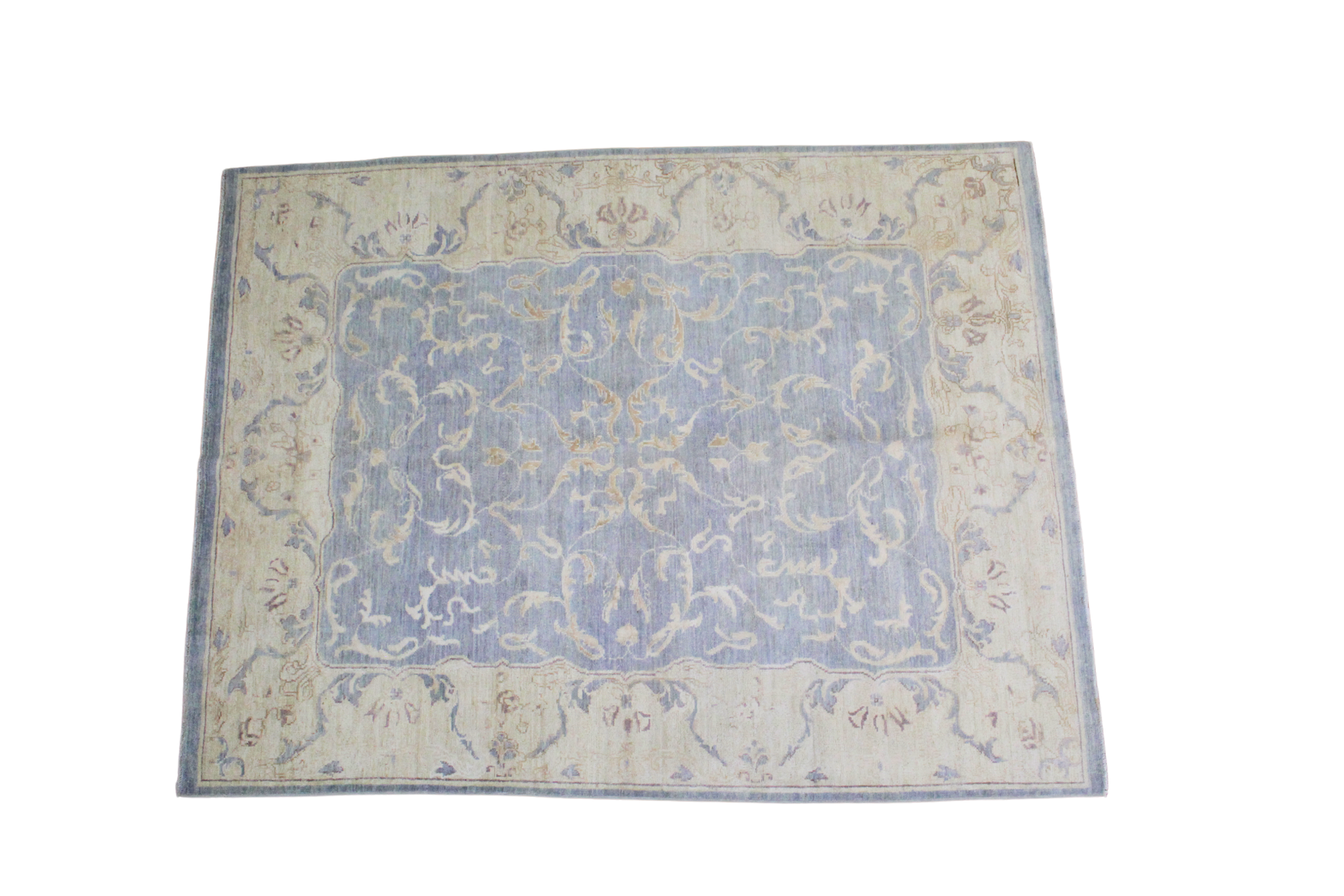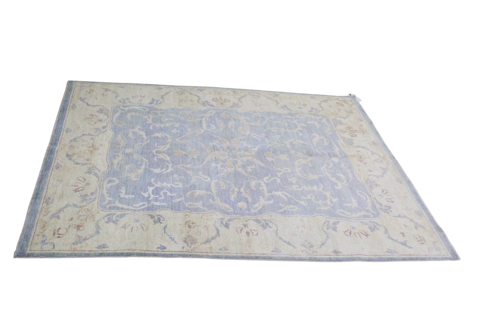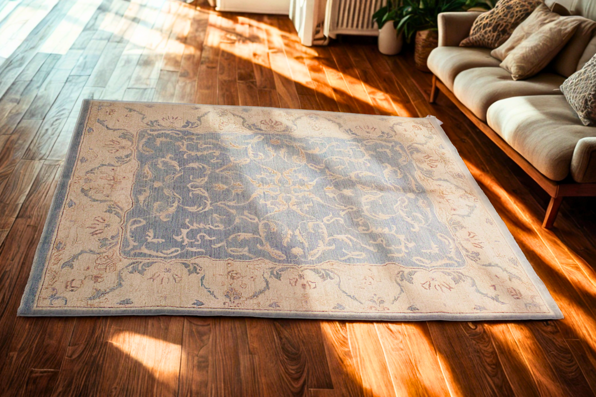 Rug U48 is a 4.4 x 6.5 hand-knotted Tabriz rug from Afghanistan, offering a refined take on classical Persian elegance. The soft, powder blue field is delicately adorned with scrolling arabesques and floral vines in ivory and muted taupe, all framed by a wide border in a creamy tone that enhances the overall sense of openness and airiness. The design is subtle yet intricate, evoking the high artistry associated with traditional Tabriz weaving.