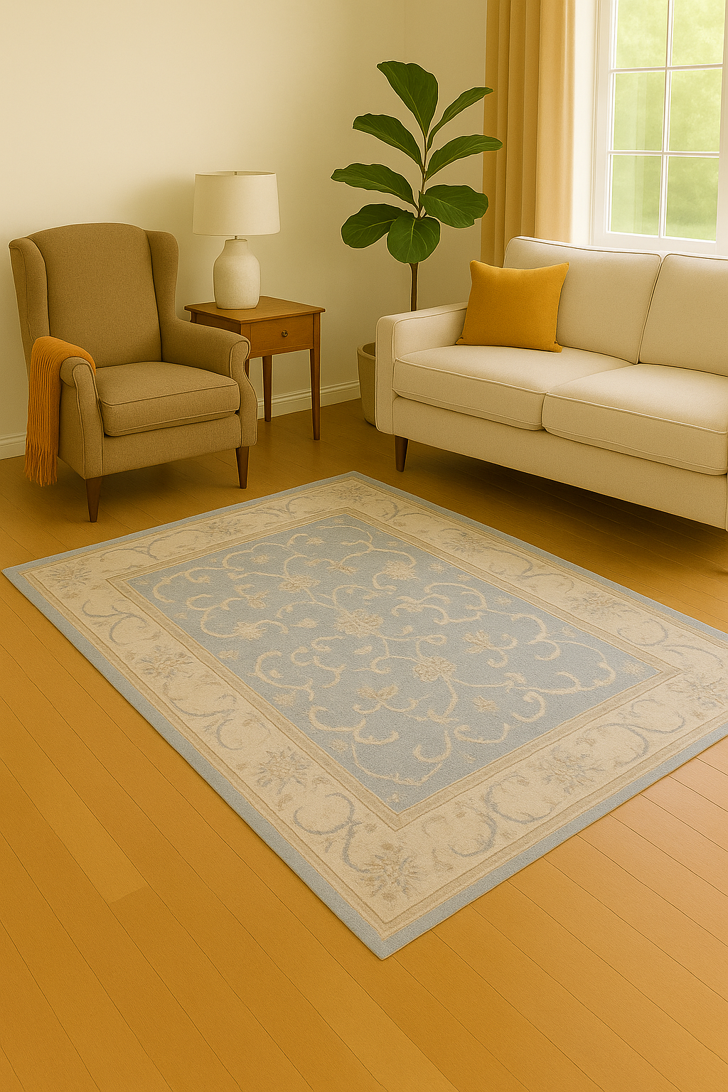 Woven from high-quality wool and finished with a lightly distressed touch, this rug has a calm, luminous presence—perfect for brightening a study, bedroom, or living space. Its clean aesthetic and timeless motifs make it a versatile piece that complements both contemporary and traditional interiors.