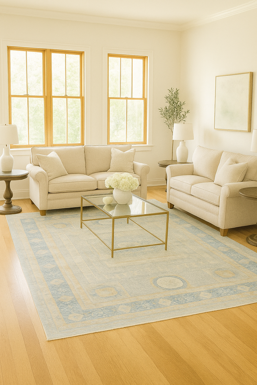 Its ethereal coloration and refined craftsmanship make it ideal for formal living areas, serene bedrooms, or any space seeking quiet sophistication and classical beauty.