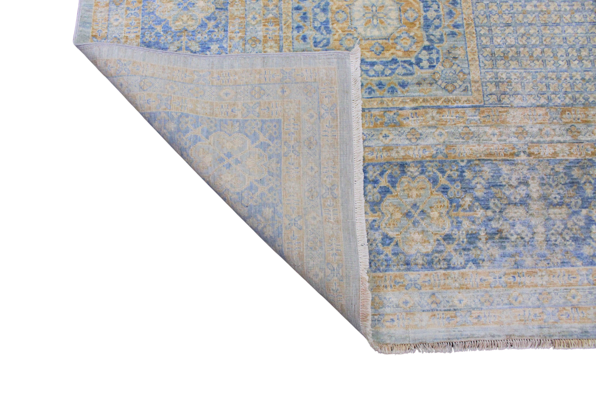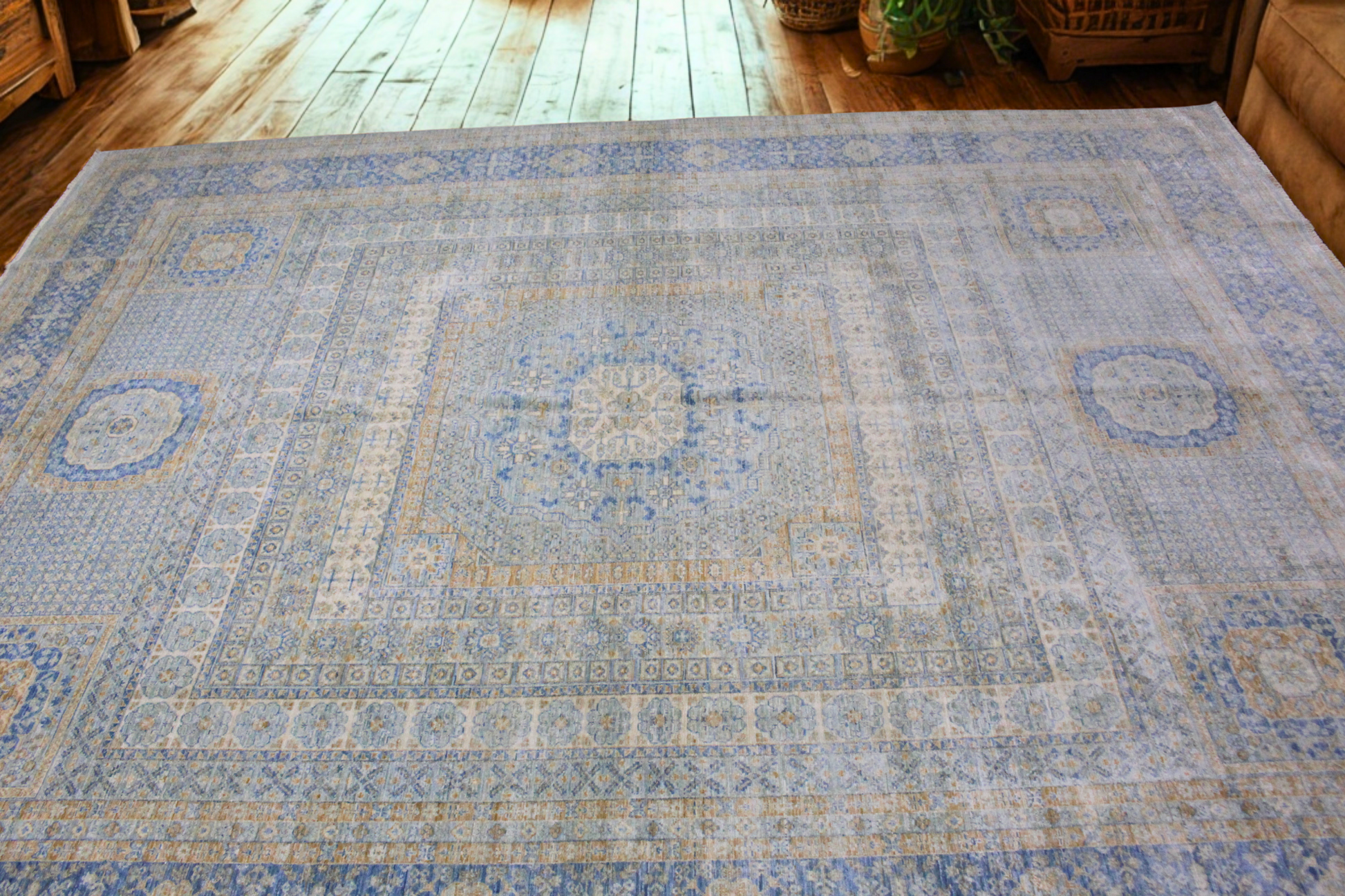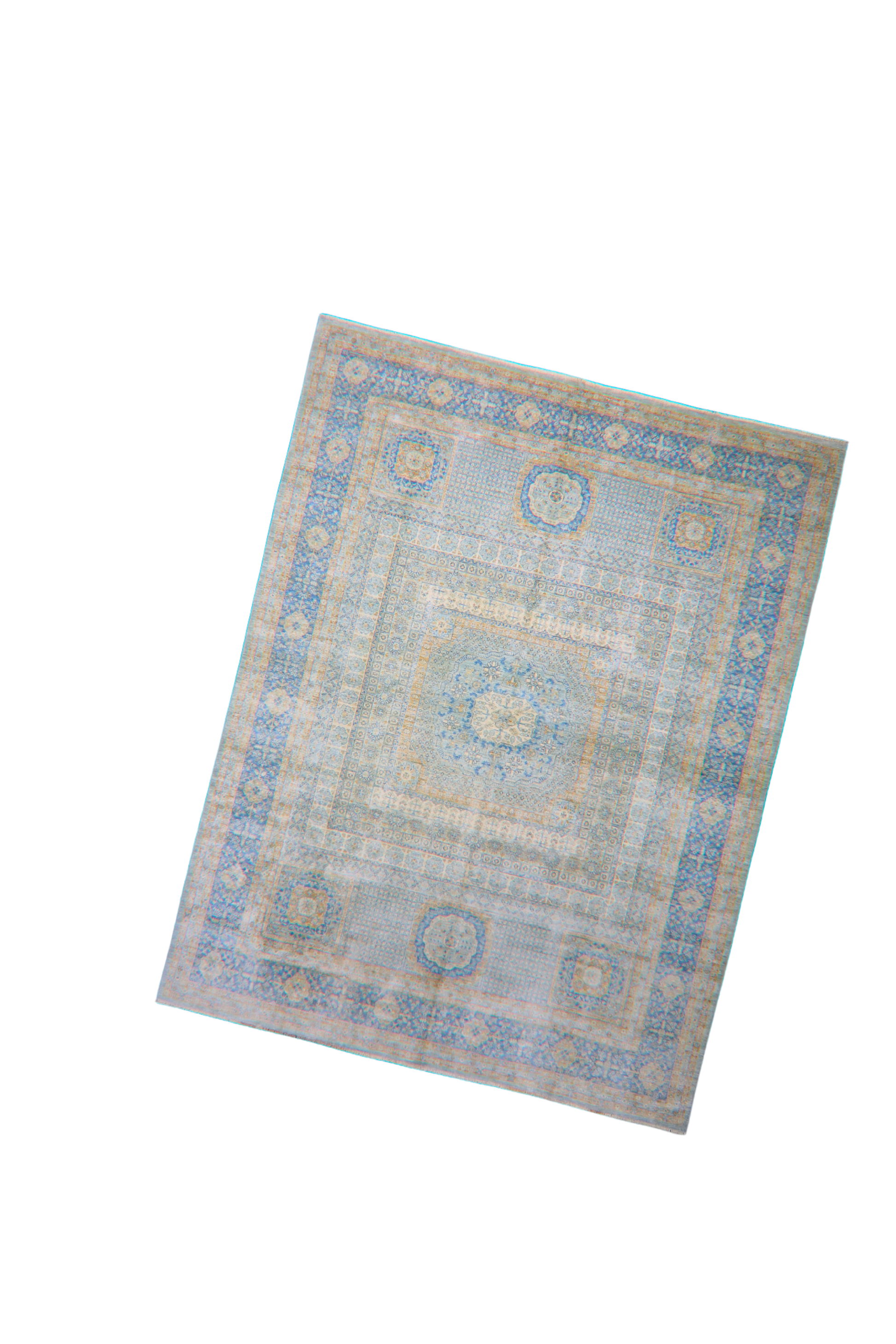 This Fine Afghan rug (8.10 × 11.9 ft) is a testament to masterful precision and subtle opulence. Woven in an intricate geometric medallion and cartouche layout, the design unfolds with near-symmetrical clarity, softened by a misty palette of powder blue, antique ivory, and soft beige. The finely knotted motifs, framed in tiered borders and accentuated by delicate rosette medallions, give the rug an architectural harmony reminiscent of tiled palace floors.