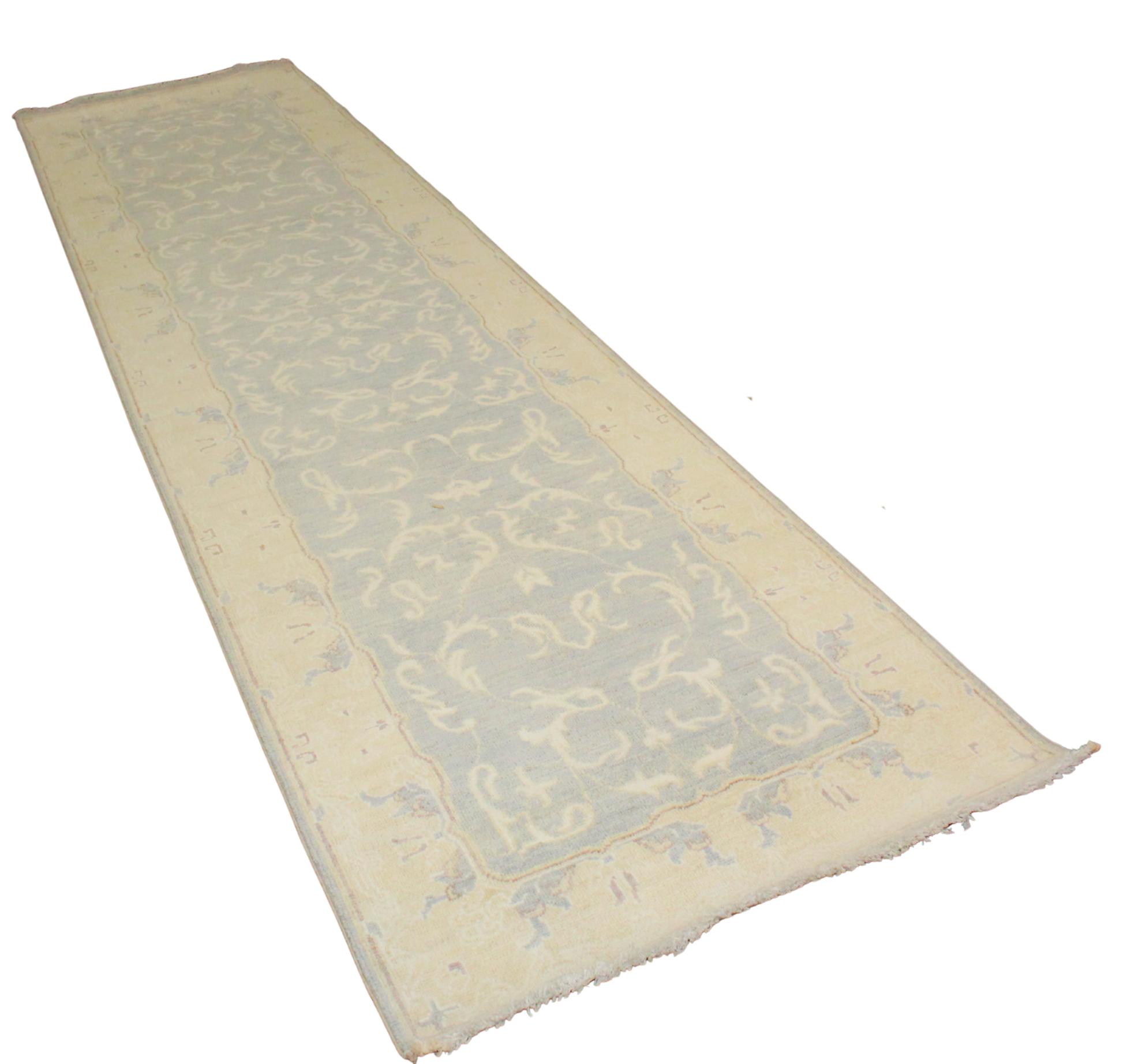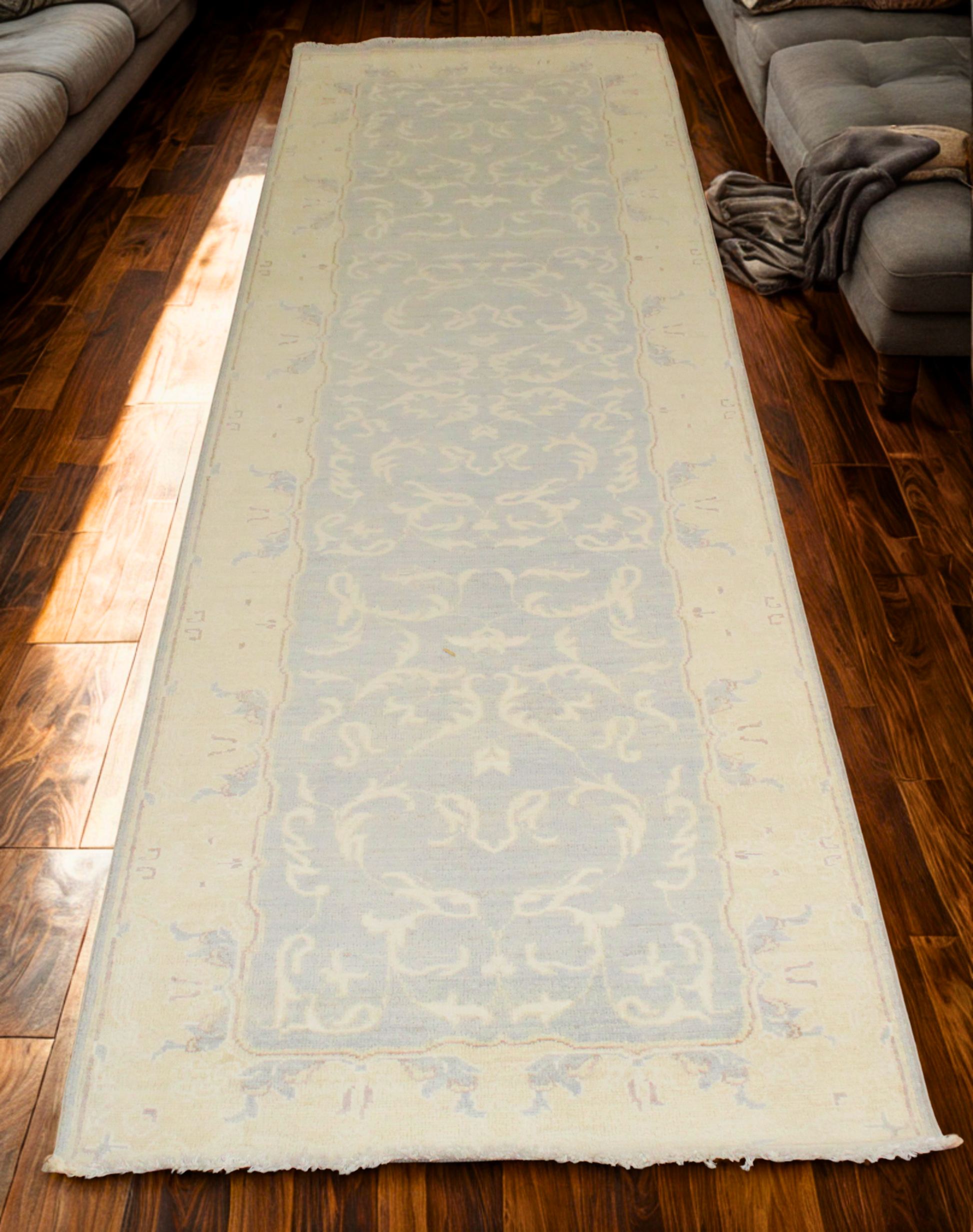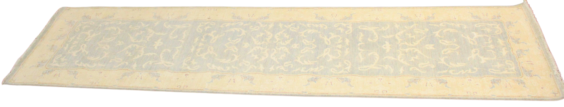 A perfectly balanced companion to its pair, this hand-knotted Afghan Tabriz runner carries the same serene elegance in soft ivory and pale silver-blue tones. The field is alive with scrolling arabesques, drawn in delicate curves that feel airy and refined. A broad cream border, punctuated by subtle floral motifs, grounds the piece with classic symmetry.