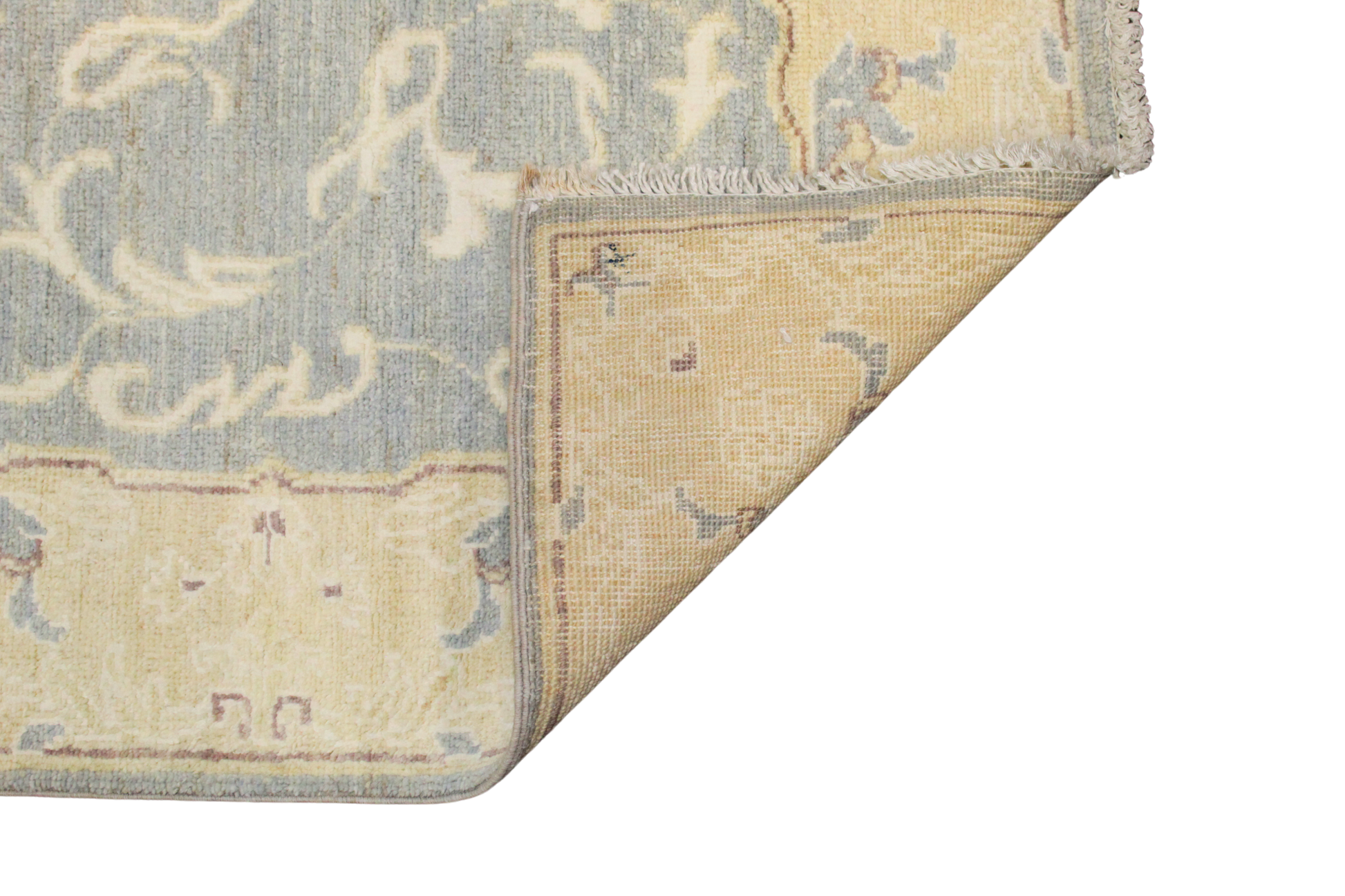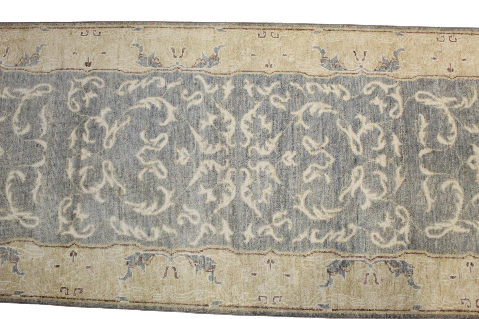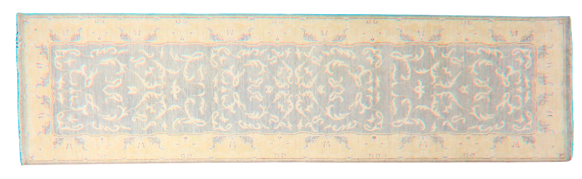 A perfectly balanced companion to its pair, this hand-knotted Afghan Tabriz runner carries the same serene elegance in soft ivory and pale silver-blue tones. The field is alive with scrolling arabesques, drawn in delicate curves that feel airy and refined. A broad cream border, punctuated by subtle floral motifs, grounds the piece with classic symmetry.