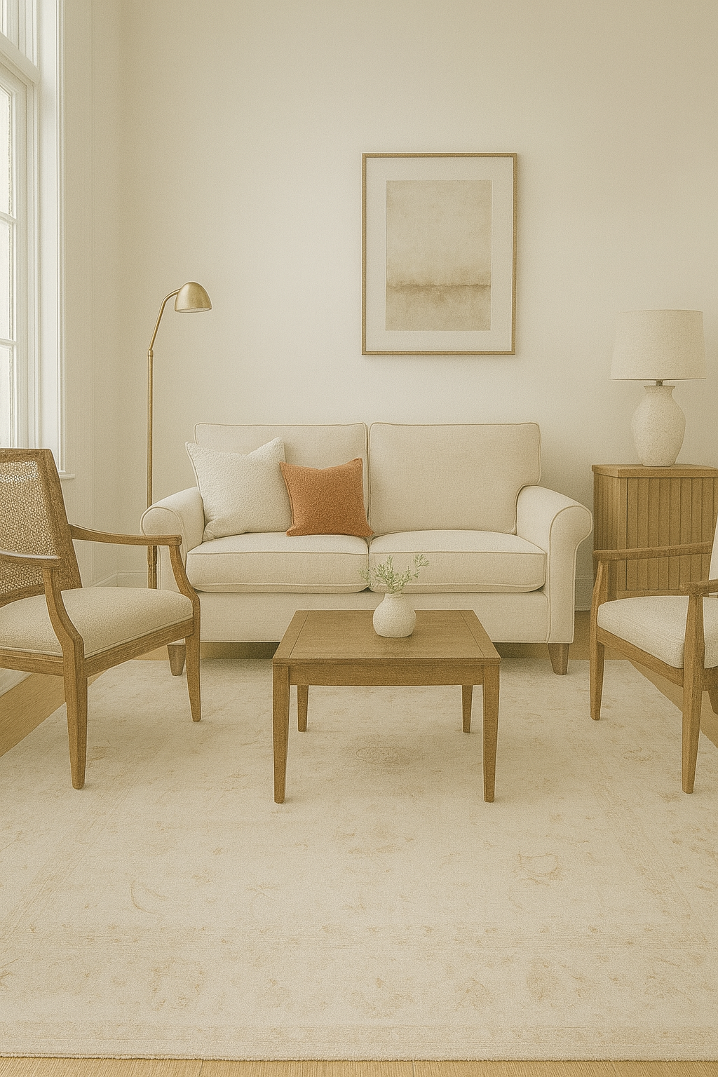 Its generous scale and faded patina make it a sophisticated base for large-scale interiors such as formal lounges, airy living rooms, or elegant bedrooms. Ideal for spaces where softness, lightness, and balance are desired.
