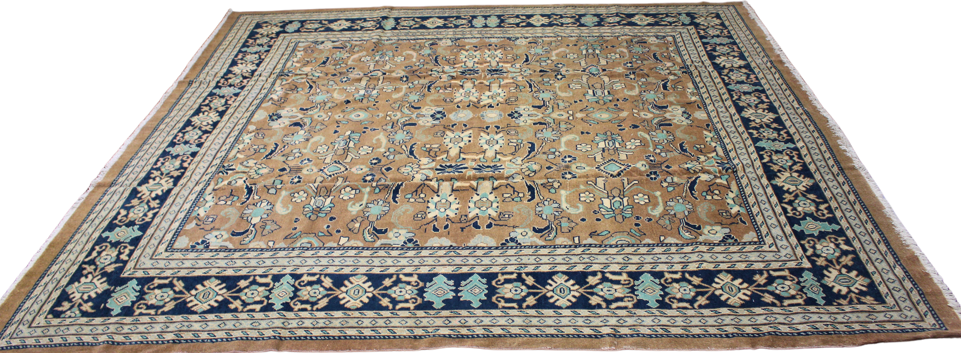 Saturated with the warmth of desert ochres and the depth of twilight blues, this antique Mahal rug from Persia (9.11 × 10.7 ft) presents a refined yet understated elegance. Woven in the early 20th century, its soft, aged field glows with golden tan tones overlaid with a symmetrical garden of stylized floral sprays, palmettes, and leafy vines rendered in delicate aqua, midnight, and ivory.