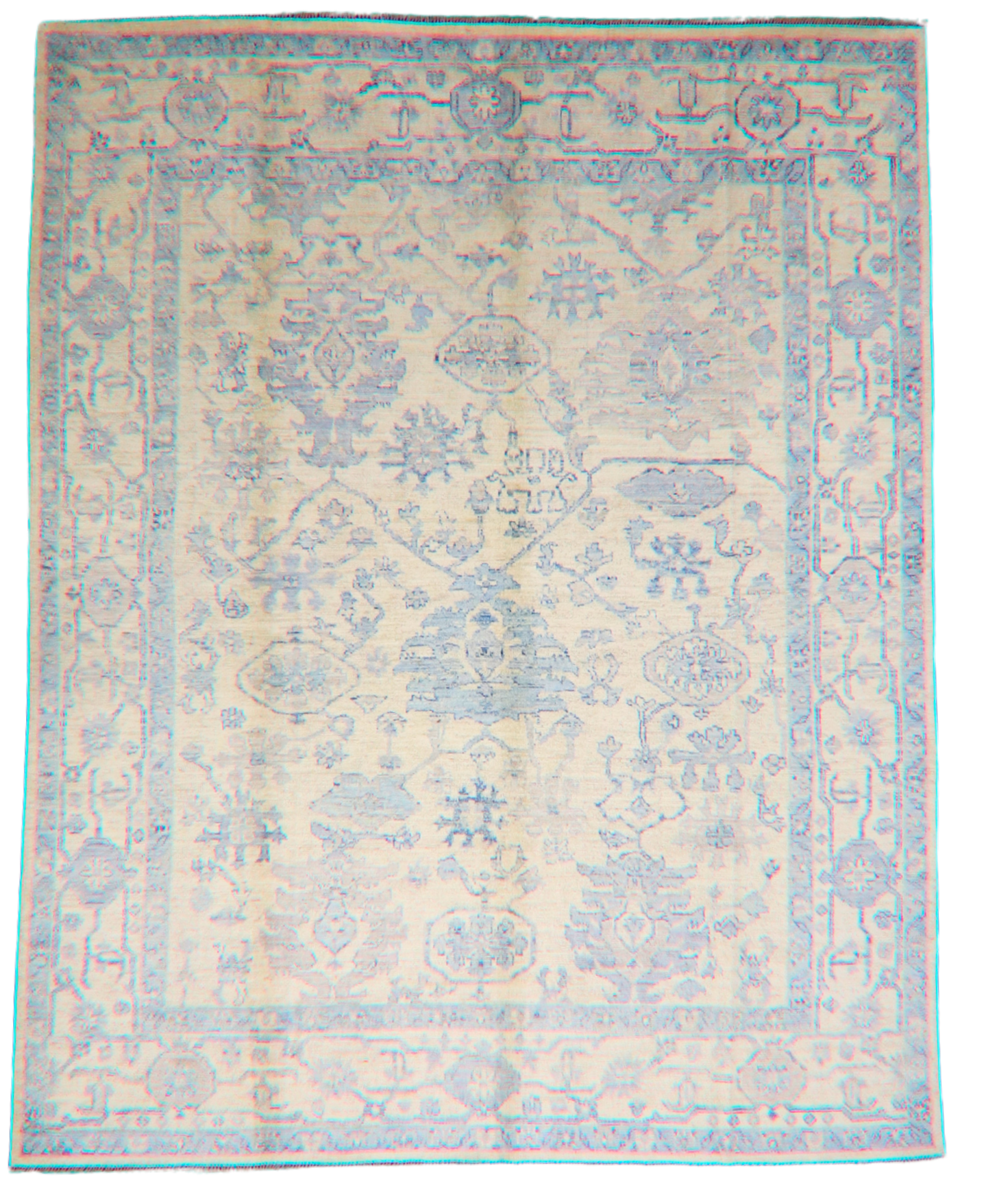 Subtle, serene, and richly elegant - this 8 × 10 ft Oushak rug from Afghanistan offers a masterclass in understated beauty. The softly faded ivory ground is graced with delicate motifs in powder blue and misty gray, presenting a gentle take on traditional Oushak florals and medallions. The wide border, finely composed with vine scrolls and rosettes, frames the field with quiet strength.