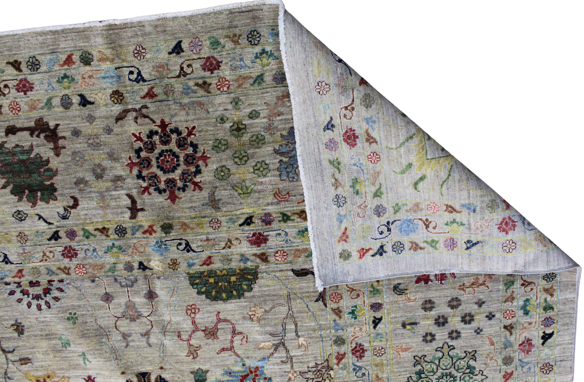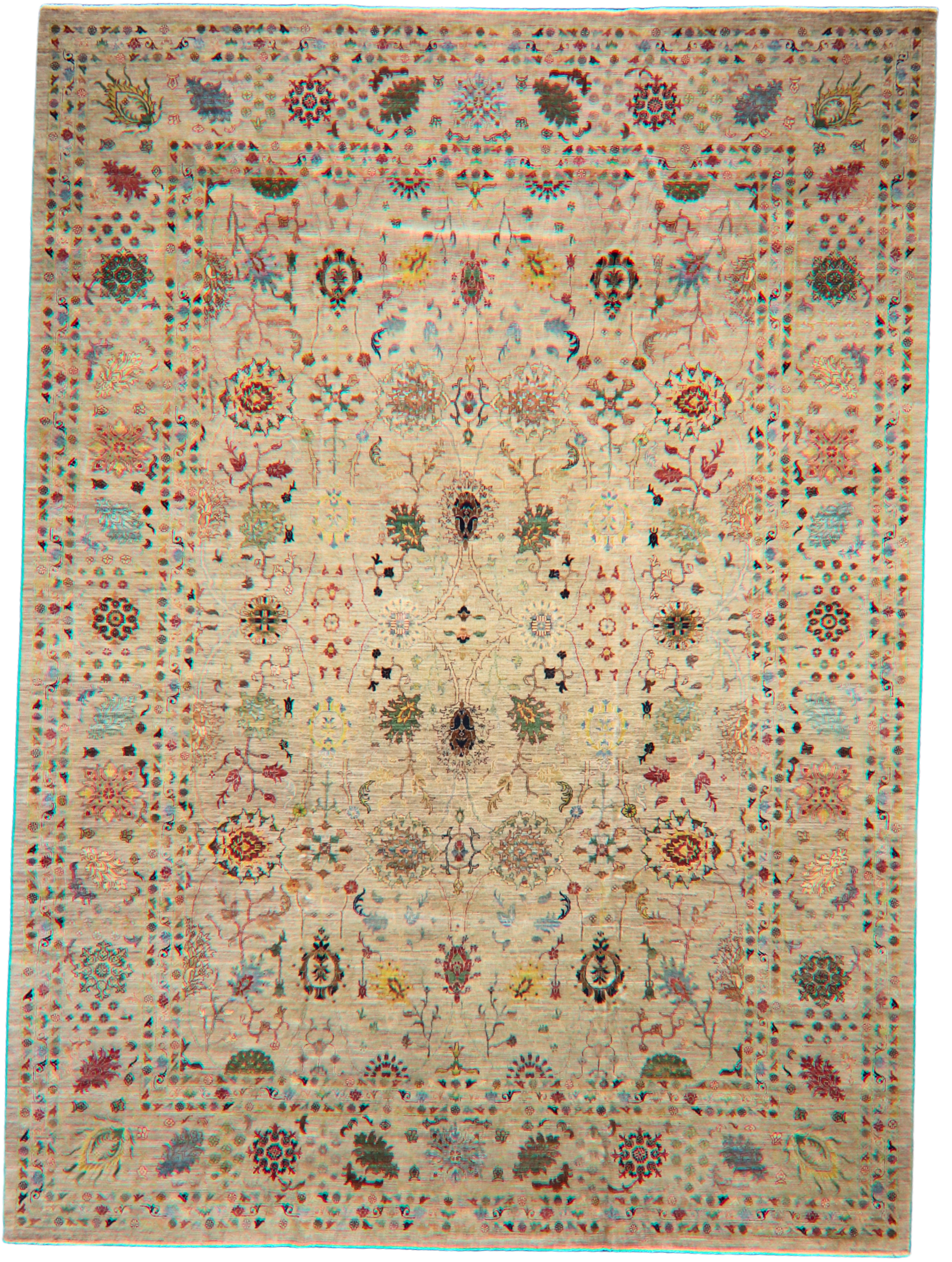 Bursting with life and color, this Afghan Tabriz rug is a rich botanical tapestry woven in the spirit of Persian garden carpets. The ivory ground forms a natural canvas for delicate vines, rosettes, blossoming shrubs, and cypress trees — each element rendered in vivid jewel tones with a painterly touch.