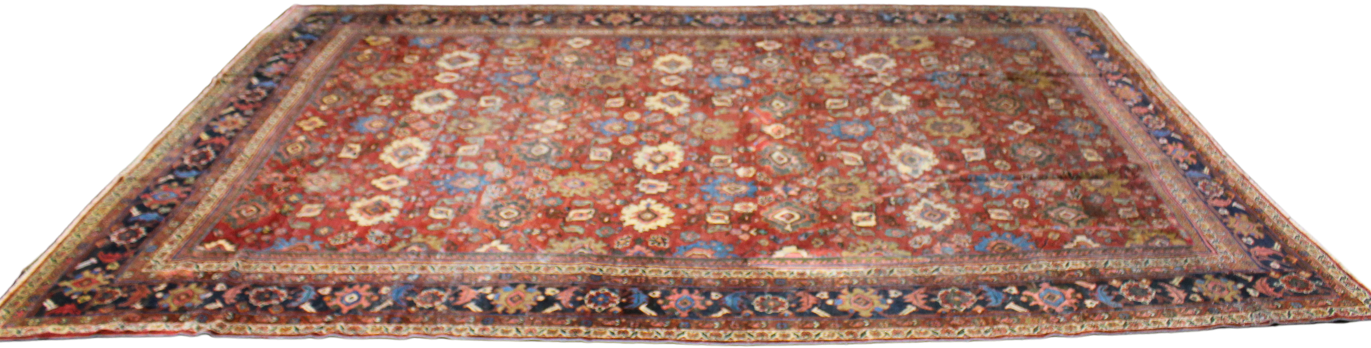 Despite areas of visible wear, the rug retains remarkable visual presence, its patina only adding to its storied character. A rich navy border filled with palmettes and vine scrolls lends grounded contrast and frames the rug with distinction.