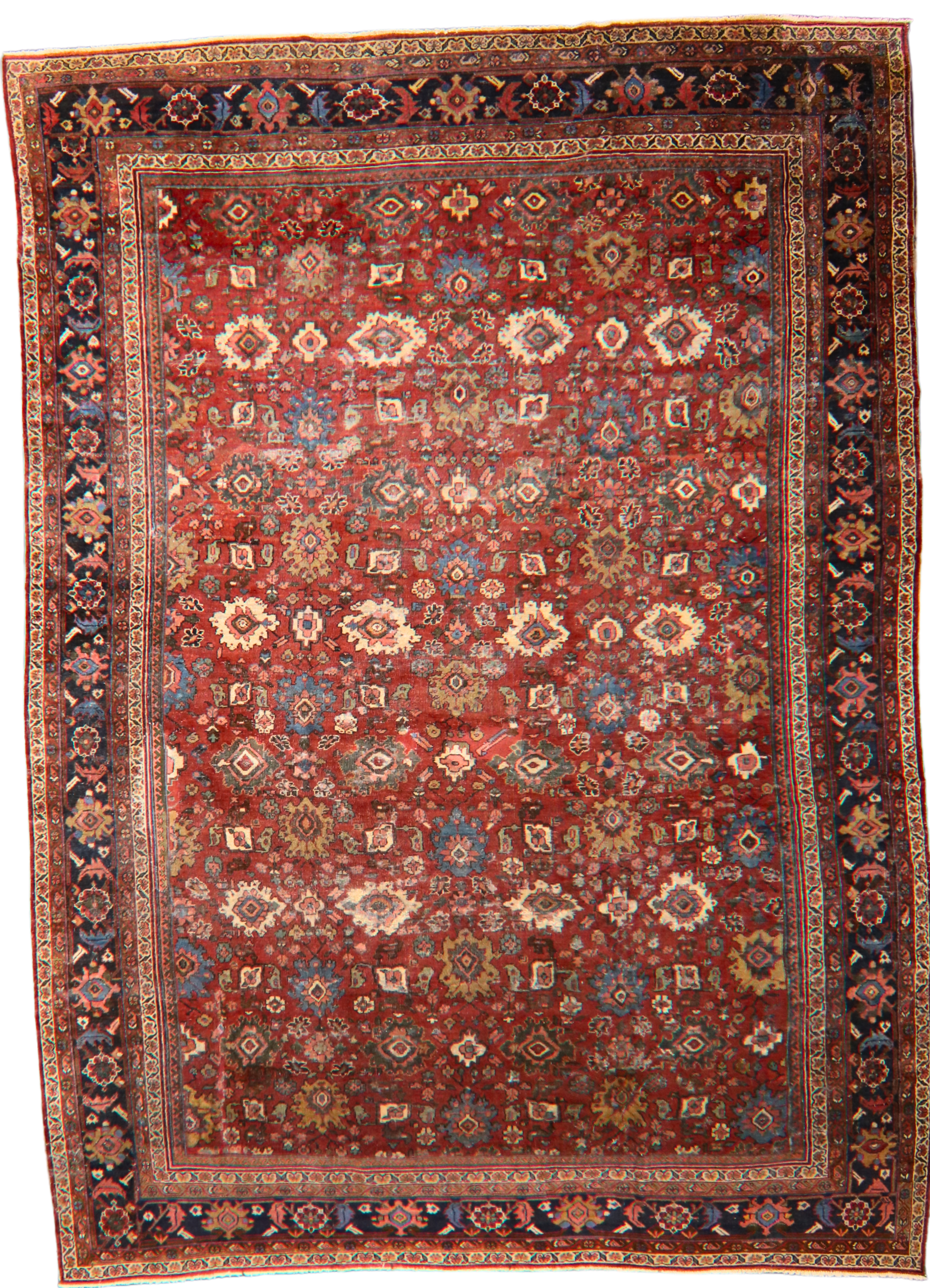 This expansive antique Mahal rug from Persia (10.4 × 13.5 ft) radiates old-world charm with a saturated red field hosting a symphony of stylized floral rosettes and stepped medallions in deep blues, creams, and soft greens. Woven in the early 20th century (circa 1920s), its design celebrates the classic Persian garden layout—balanced, ordered, and endlessly intricate.