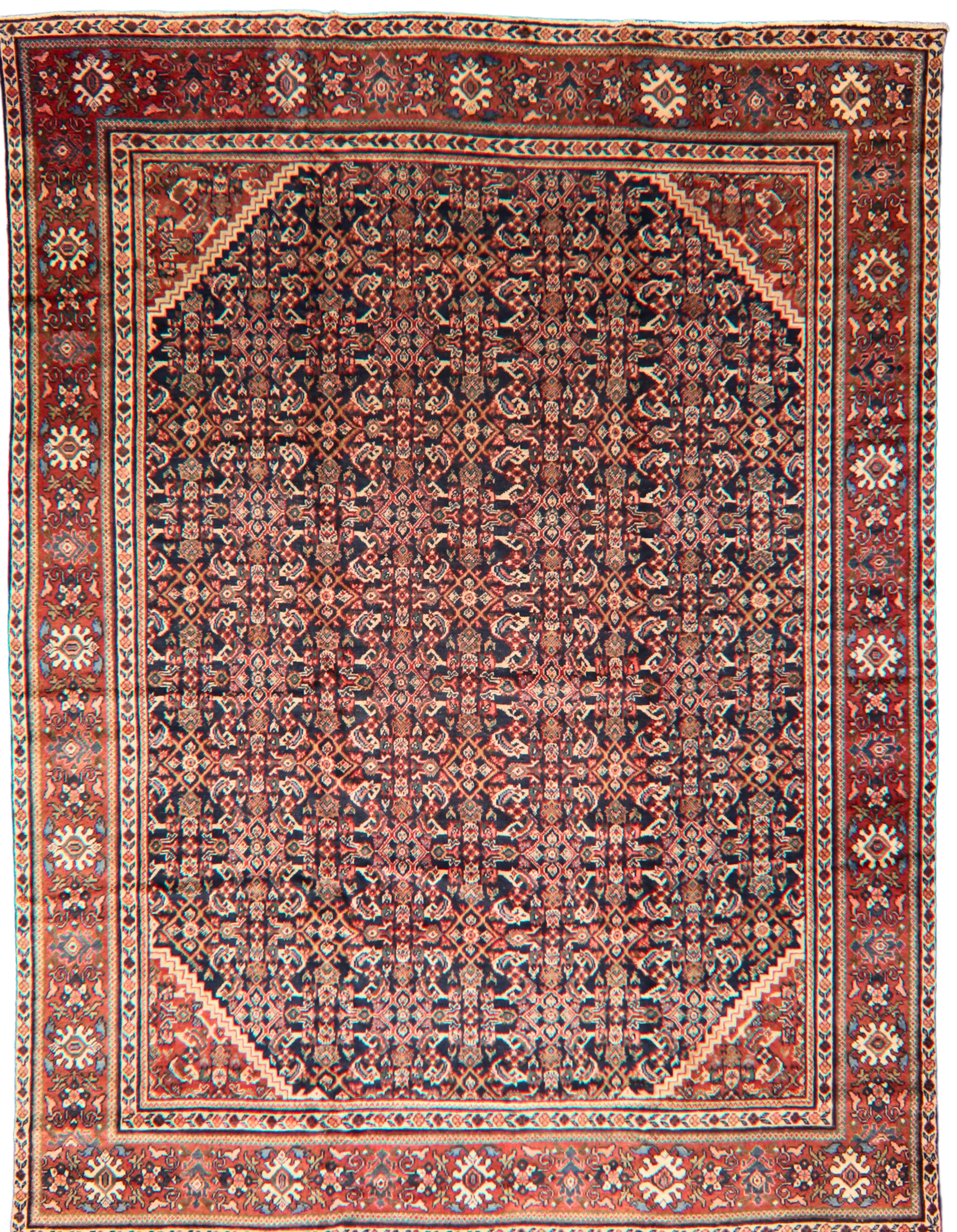 Design: Allover Herati motif with stepped corner spandrels and classic floral borders